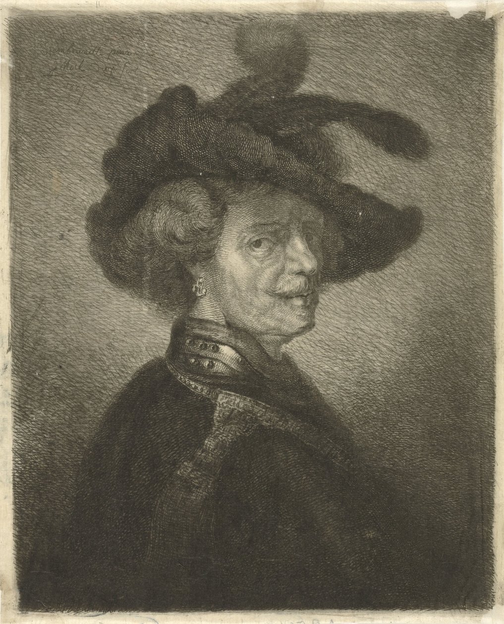 Tronie van een man met gevederde baret(Tronie of a Man with a Feathered Beret)Johannes Mock(print maker),Rembrandt van Rijn(after painting by) |