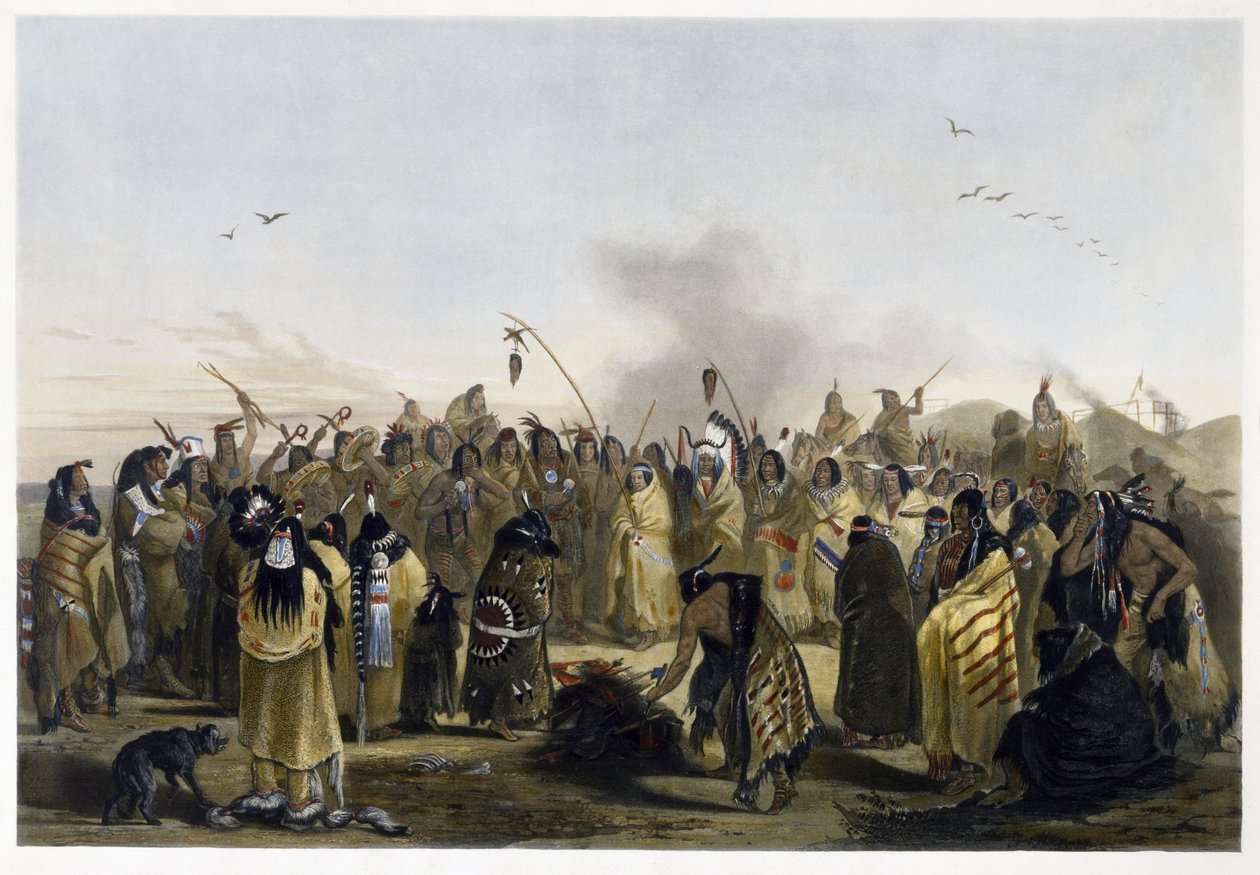 Scalpdans van de Minitarres, 1843-1844(Scalp Dance of the Minitarres, 1843-1844 (aquatint))Karl Bodmer |
