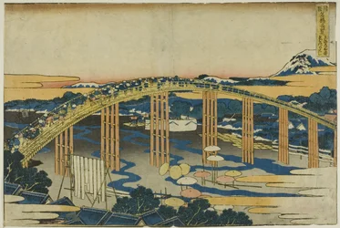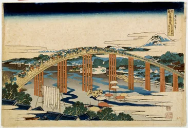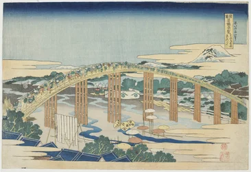 Yahagi-brug bij Okazaki op de Tokaido Tokaido Okazaki Yahagi no hashi, uit de serie...(Yahagi Bridge at Okazaki on the Tokaido Tokaido Okazaki Yahagi no hashi, from the se..., ca. 1830. )Katsushika Hokusai |