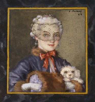 Dame met een hond, 1928(Lady with a Dog, 1928 (bodycolour within a delineated border in black ink surrounding a fictive frame on white paper))Konstantin Andreevic Somov |