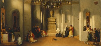 De roeping van Heilige Lucia, eerste paneel van predella van Altaarstuk van Heilige Lucia(The calling of Saint Lucia, first panel of predella of Altarpiece of Saint Lucia or Saint Lucia Before Judge by Lorenzo Lotto (1480 ca- 1556), oil on panel, 32x69 cm)Lorenzo Lotto |