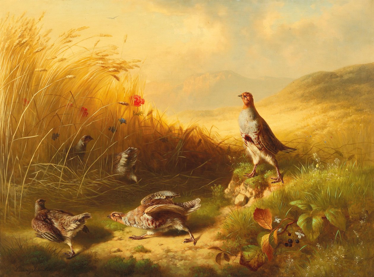 Patrijs met jongen in de bergweiden(Partridge with Fledglings on the Mountain Pastures)Ludwig Schuster |