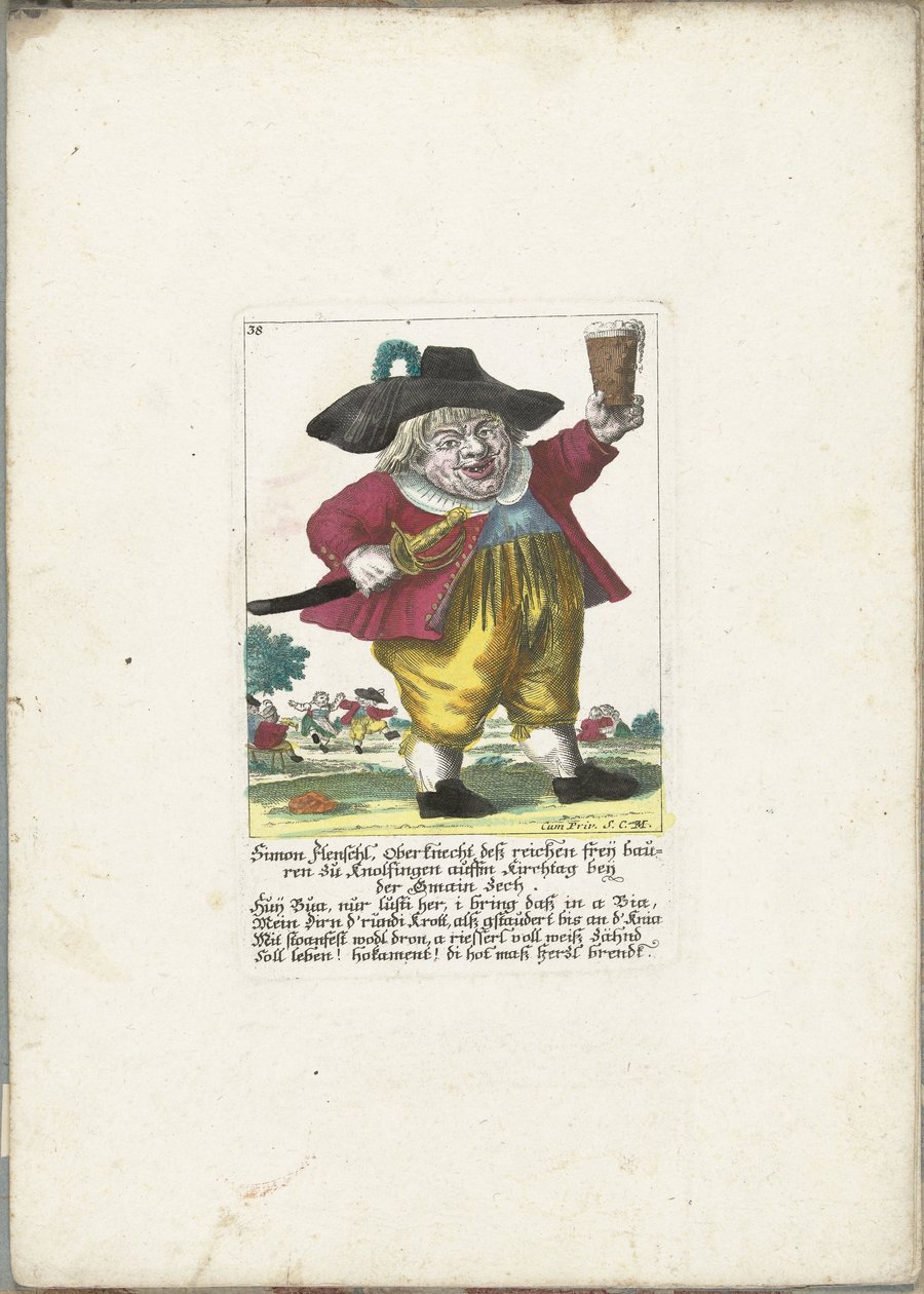 De dwerg Simon Flenschl, ca. 1710(De dwerg Simon Flenschl, ca. 1710 Simon Flenschl, Oberknecht deß reichen freij bauren zu Knolsingen auffm Kirchtag beij der Gmain Zech (title on object) Il Callotto resurcitato oder Neu eingerichtes Zwerchen Cabinet (series title))Martin Engelbrecht (attributed to)(print maker),Unknown |