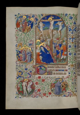Getijdenboek van Karel de Edele, Koning van Navarra 1361-1425: fol. 185r, Kruisiging, ca. 1405(Hours of Charles the Noble, King of Navarre 1361-1425: fol. 185r, Crucifixion, c. 1405. )Master of the Brussels Initials and Associates |