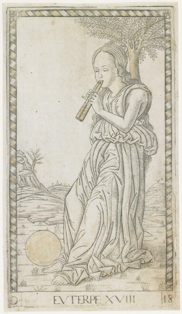 Euterpe, c.1465 (gravure verhoogd met goud)(Euterpe, c.1465 (engraving heightened with gold))Master of the E-Series Tarocchi Master of the E-Series Tarocchi |