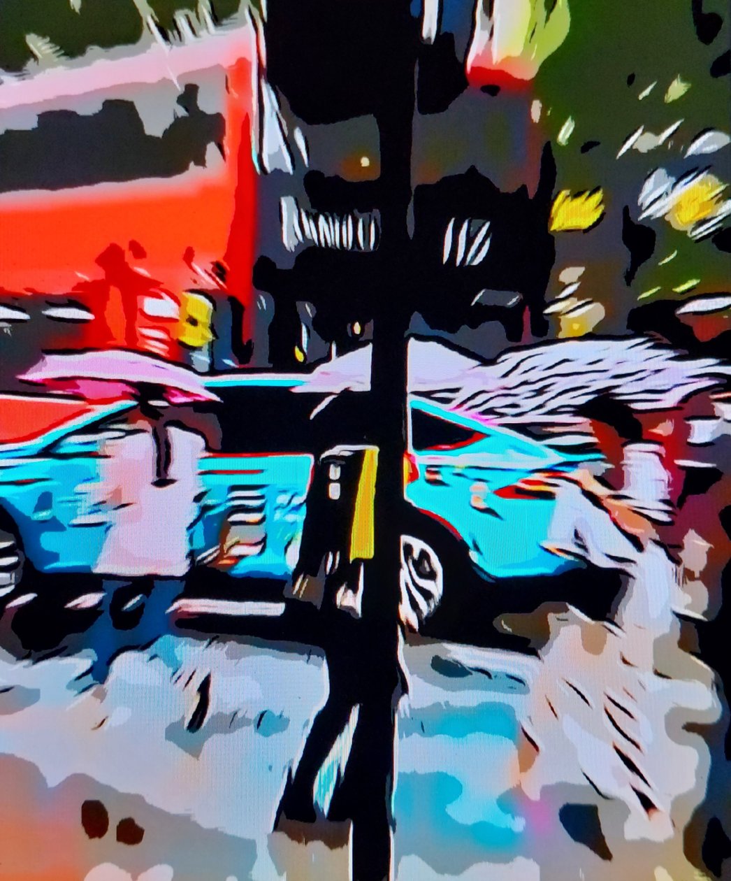 In zijn kunst, een effect van digitale manipulatie, transformeert hij gewone beelden in