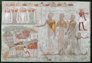 Inhuldiging van de koning door de godin Ishtar, uit het paleis van Zimri-Lim, Mari, Midden-Eufraat, Isin-Larsa Periode, c.1800 v.Chr.(Investiture of the king by the goddess Ishtar, from the Palace of Zimri-Lim, Mari, Middle Euphrates, Isin-Larsa Period, c.1800 BC (wall painting))Mesopotamian |