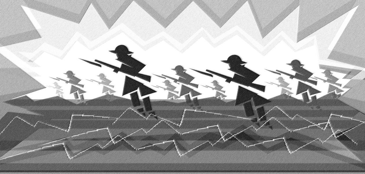 Eerste Wereldoorlog soldaten met bajonetten - komen uit loopgraven(World War One soldiers with bayonets - emerging from trenches)Neale Osborne |