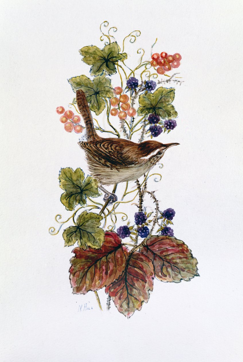 Winterkoning op een tak met bessen(Wren on a spray of berries)Nell Hill |