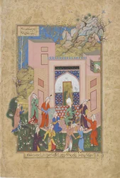 De wispelturige oude minnaar wordt van het dak gegooid, folio uit een Haft awrang (Zeven tronen) door Jami (gest. 1492) waarschijnlijk Mashad, Khurasan, Iran, Safavidische dynastie, 1556-1565(The Fickle Old Lover is Knocked Off the Rooftop, folio from a Haft awrang (Seven thrones) by Jami (d.1492) probably Mashad, Khurasan, Iran, Safavid dynasty, 1556-1565 (ink, opaque watercolour and gold)Persian School |