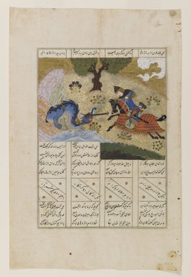 Gushtasp doodt de draak, uit de Shahnama van Firdawsi, 1483(Gushtasp Slaying the Dragon, from the Shahnama of Firdawsi, 1483 (ink, opaque wc & gold on paper))Persian School |