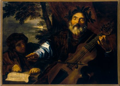 De dichter Homerus met een lyra da gamba, een instrument dat gebruikt werd om ballades te begeleiden in de (schilderij op doek)(The poet Homer, with a lyra da gamba, an instrument used to accompany ballads in the (painting on canvas))Pier Francesco Mola |