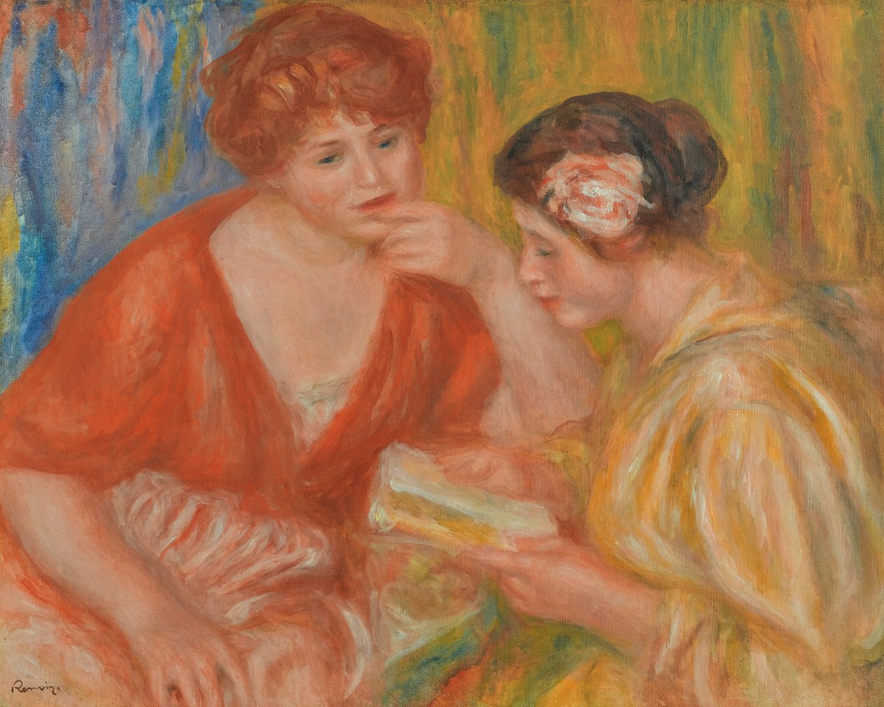 Lezing, twee vrouwen in rode en roze blouses(LA LECTURE, DEUX FEMMES AUX CORSAGES ROUGE ET ROSE)Pierre-Auguste Renoir |