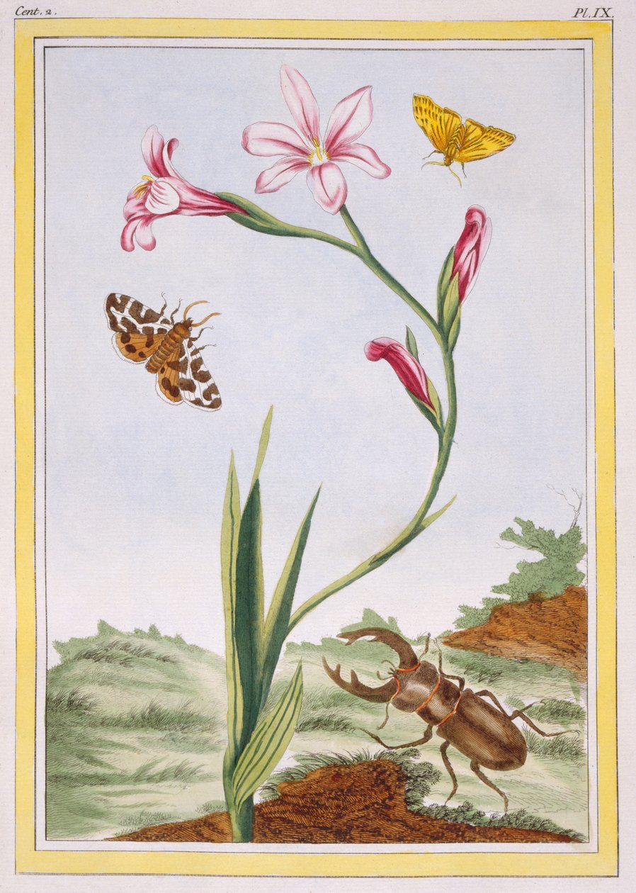 L'Ixia (vleeskleurige Ixia) en Hertenkever, c.1776(L'Ixia (flesh-coloured Ixia) and Stag Beetle, c.1776 (hand-coloured engraving))Pierre-Joseph Buchoz |