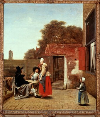 Een man die rookt en een vrouw die drinkt in een binnenplaats, ca. 1658-60(A Man Smoking and a Woman Drinking in a Courtyard, c.1658-60)Pieter de Hooch |