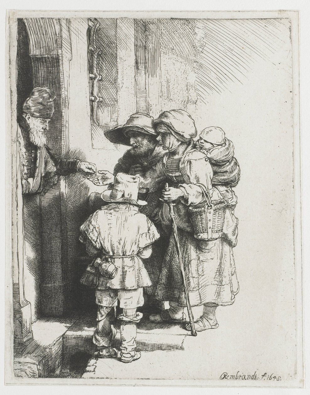 Een blinde draailierspeler en familie die aalmoezen ontvangen(A Blind Hurdy-gury Player and Family Receiving Alms)Rembrandt van Rijn |