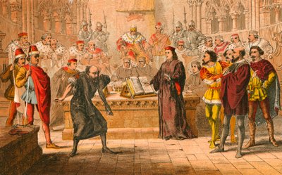 Shylock spreekt in De koopman van Venetië, akte IV, scène I, 'Is dat de wet', uit 'The Illustrated Library Shakespeare', uitgegeven Londen 1890 (kleurenlitho)(Shylock speaks in The Merchant of Venice, Act IV, Scene I, 'Is that the law?', from 'The Illustrated Library Shakespeare', published London 1890 (colour litho))Robert Dudley |
