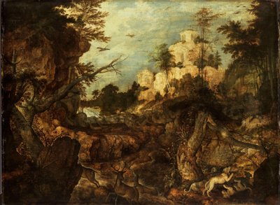 Wilde zwijnenjacht in een rotsachtig landschap(Wild boar hunt in a rocky landscape)Roelant Savery(painter) |