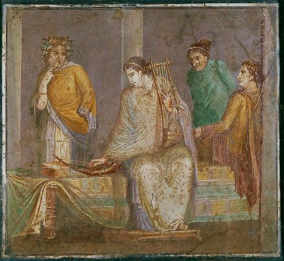 Romeinse kunst: een citharist. Fresco van de site van Castellammare di Stabia nabij Napels. 1e eeuw n.Chr. (fresco)(Roman art: a cythared. Fresco from the site of Castellammare di Stabia near Naples.1st century AD (fresco))Roman |