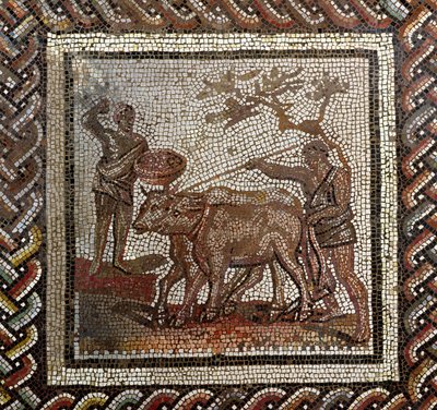 Ploegen, uit Saint-Romain-en-Gal, Rhône-Alpes, Frankrijk, 3e eeuw na Chr.(Ploughing, from Saint-Romain-en-Gal, Rhone-Alpes, France, 3rd century AD (mosaic))Roman |