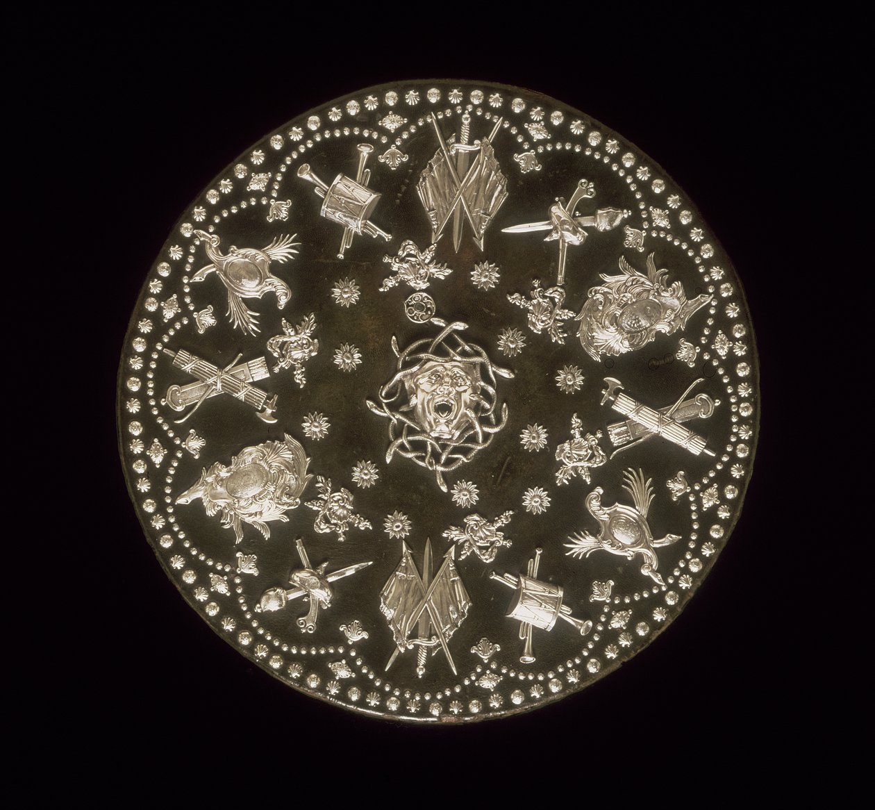 Kleding Targe, deel van de uitrusting gepresenteerd aan Charles Edward Stuart door James, 3e Hertog van Perth, 1740(Dress Targe, part of the accoutrements presented to Charles Edward Stuart by James, 3rd Duke of Perth, 1740 (wood, pigskin and silver))Scottish School |