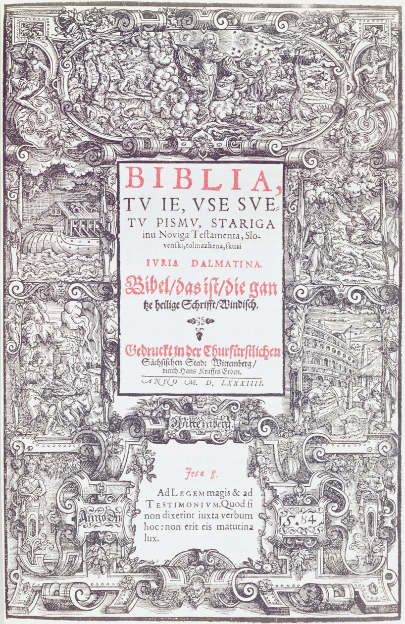Eerste Bijbel gedrukt in de Sloveense taal, 1584 (gedrukt papier)(First Bible to be printed in Slovene language, 1584 (printed paper))Slovenian School |