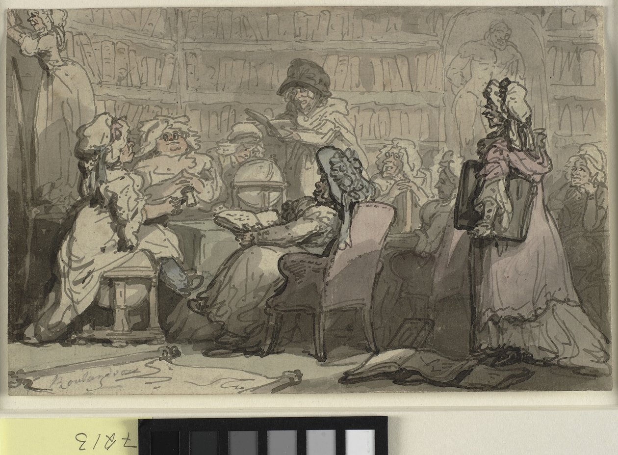 Een bijeenkomst van een bluestocking club in een bibliotheek(A bluestocking club meeting in a library)Thomas Rowlandson |
