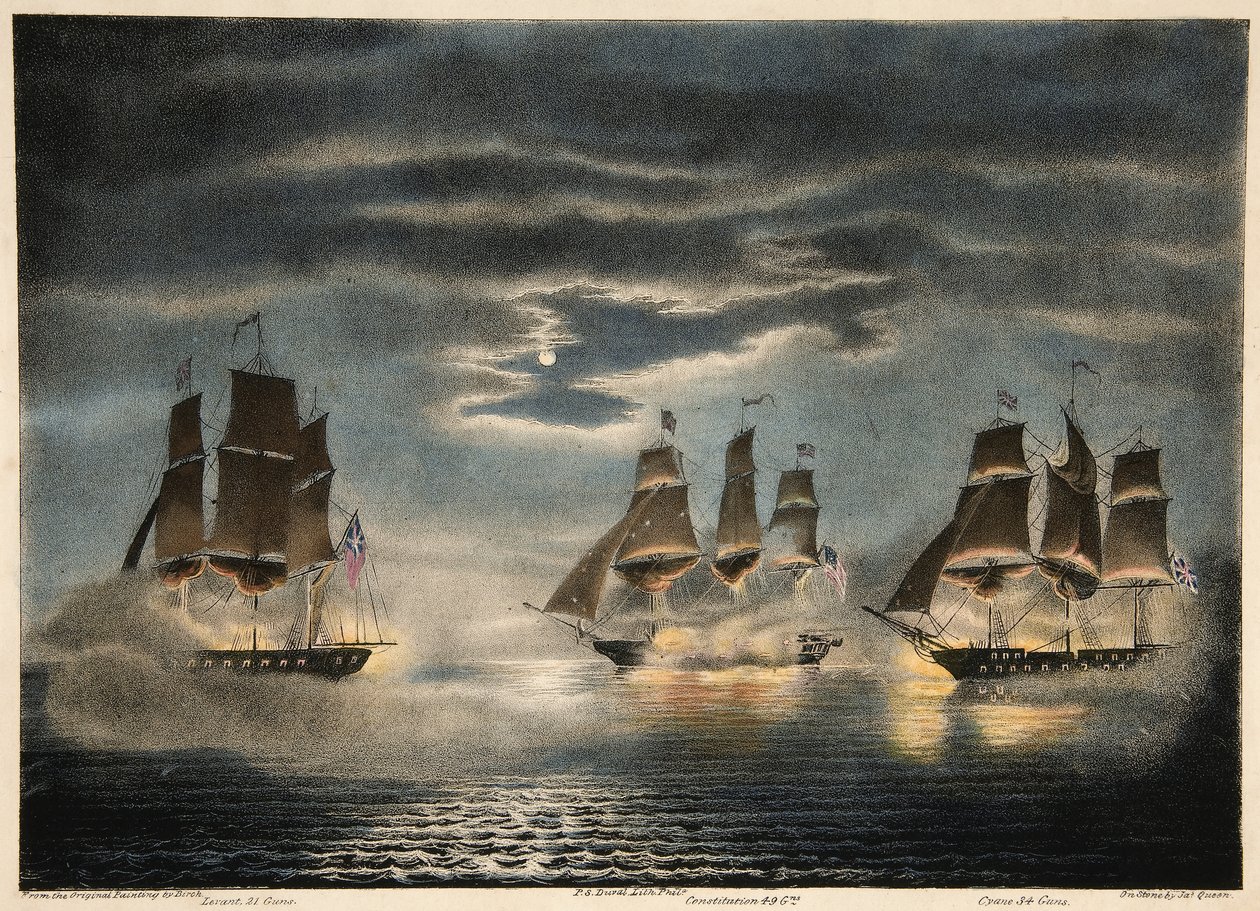 Verovering van H.M. Schepen Cyane & Levant, door de U.S. Fregat Constitution, uit Army and Navy Magazine(Capture of H.M. Ships Cyane & Levant, by the U.S. Frigate Constitution, from Army and Navy Magazine, pub. 1840 )Thomas after Birch |