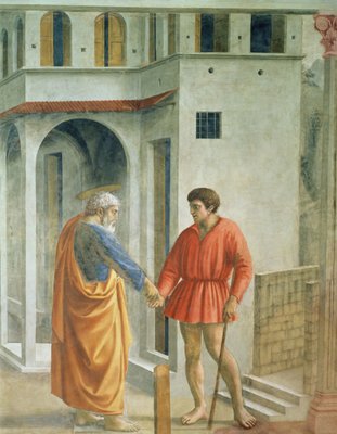 Schuldbetaling St. Peter betaalt de belastinginner (detail)(Tribute Money St. Peter pays the Tax Collector - detail of 31642, c.1427 fresco)Tommaso Masaccio |