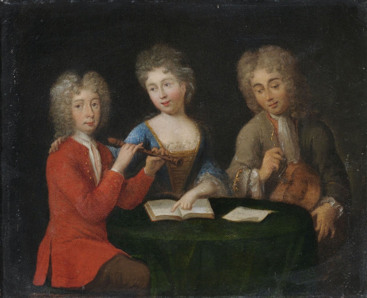Muziekles. Twee mannen en een vrouw maken muziek met fluit en draailier.(Musikstunde. Zwei Männer und eine Frau musizieren mit Flöte und Drehleier.)Unbekannt Unbekannt |