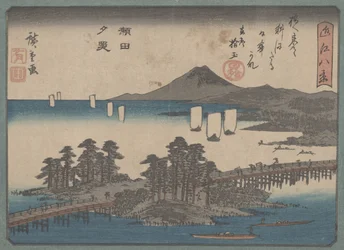 Asakusa Rijstvelden Tijdens het Festival van de Haan, ca. 1857 Uitzicht op de Naruto-wervelingen bij Awa, uit de serie Panorama van uitzichten op Kanazawa bij volle maan, uit de serie tsuki Vlakte in Kai Provincie (Kai tsuki no hara), uit de serie Zesendertig Zichten op de Fuji De Jumantsubo-vlakte in Susaki bij Fukagawa Suigin Grove en Masaki, aan de Sumida-rivier, uit Sneeuw bij het Benzaiten-heiligdom in de vijver van Inokashira, 1843-1847 Rode Snapper en Halfbeak, 1830-1844 Gekleurde bladeren bij de Kaianji-tempel, 1837-1844 Plotselinge regenbui bij Ohashi-brug bij Ataka, uit de serie Asakusa Rijstvelden tijdens het festival van de Haan uit de serie Kersenbloesems in Arashiyama, ca. 1834 Maan door Bladeren, ca. 1832 Terugkerende Zeilen bij Yabase uit de serie Acht Zichten van Omi, c.1855-8 Uitzicht op de berg Haruna in de sneeuw, uit