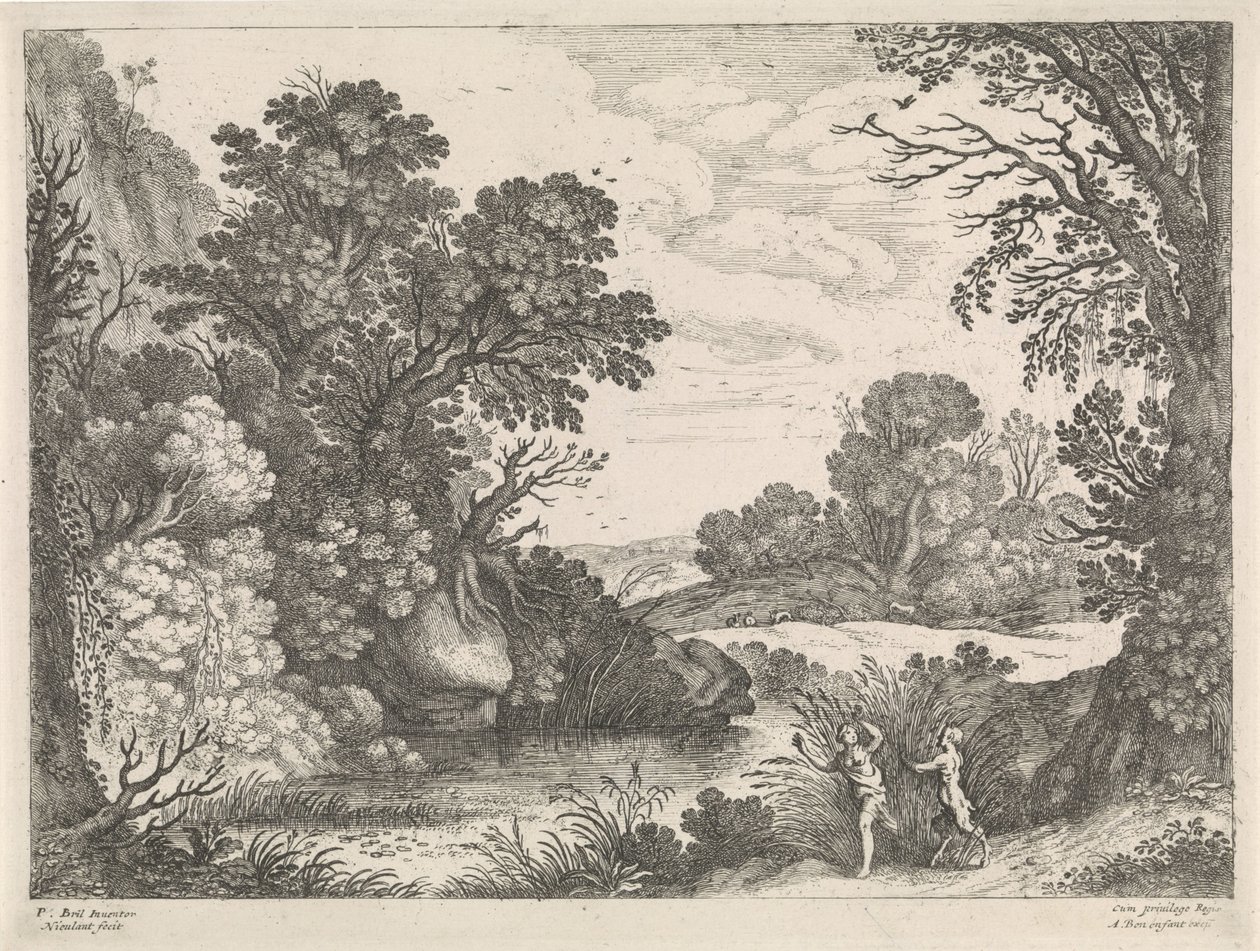 Pan en Syrinx(Pan and Syrinx)Willem van Nieulandt (II)(print maker),Paul Bril(after design by),Antoine Bonenfant(publisher) |