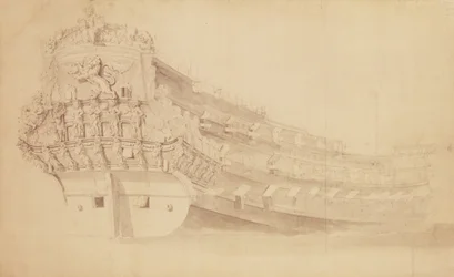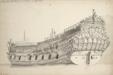 Portret van de 'Ridderschap', 66 kanonnen, van de Admiraliteit van de Maas, gebouwd in 1666 en verloren op zee in 1690, ca. 1686(Portrait of the 'Ridderschap', 66 guns, of the Admiralty of the Maas, built in 1666 and lost at sea in 1690, c.1686 (graphite, grey wash))Willem van de Velde the Younger |