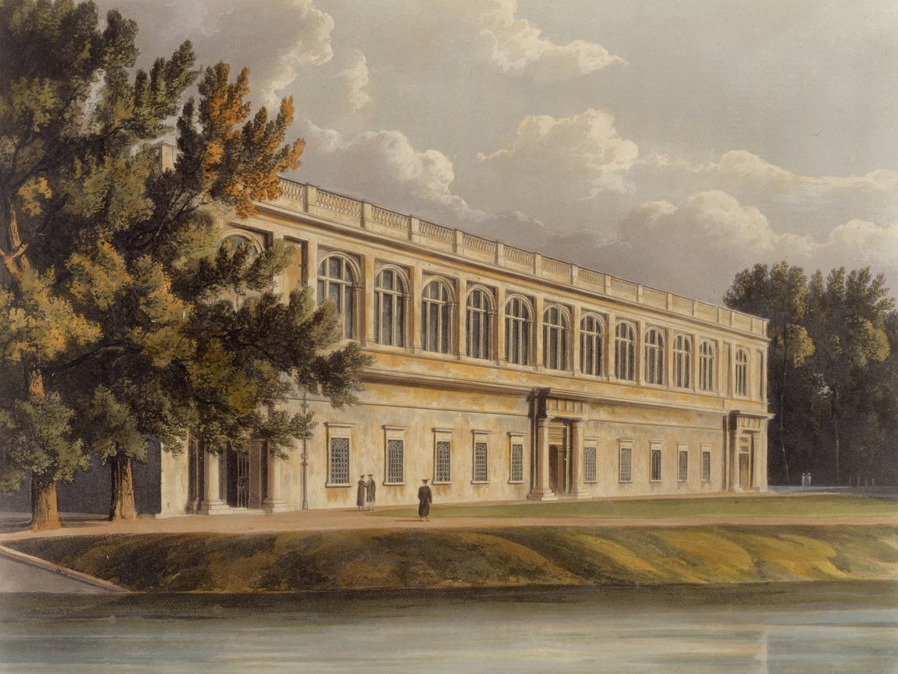 Exterieur van Trinity Library vanuit St. Johns Gardens, Cambridge, uit The History of Cambridge, gegraveerd door Joseph Constantine Stadler (fl.1780-1812), uitgegeven door R. Ackermann, 1815(Exterior of Trinity Library from St. Johns Gardens, Cambridge, from The History of Cambridge, engraved by Joseph Constantine Stadler (fl.1780-1812), pub. by R. Ackermann, 1815 (colour aquatint))William after Westall |